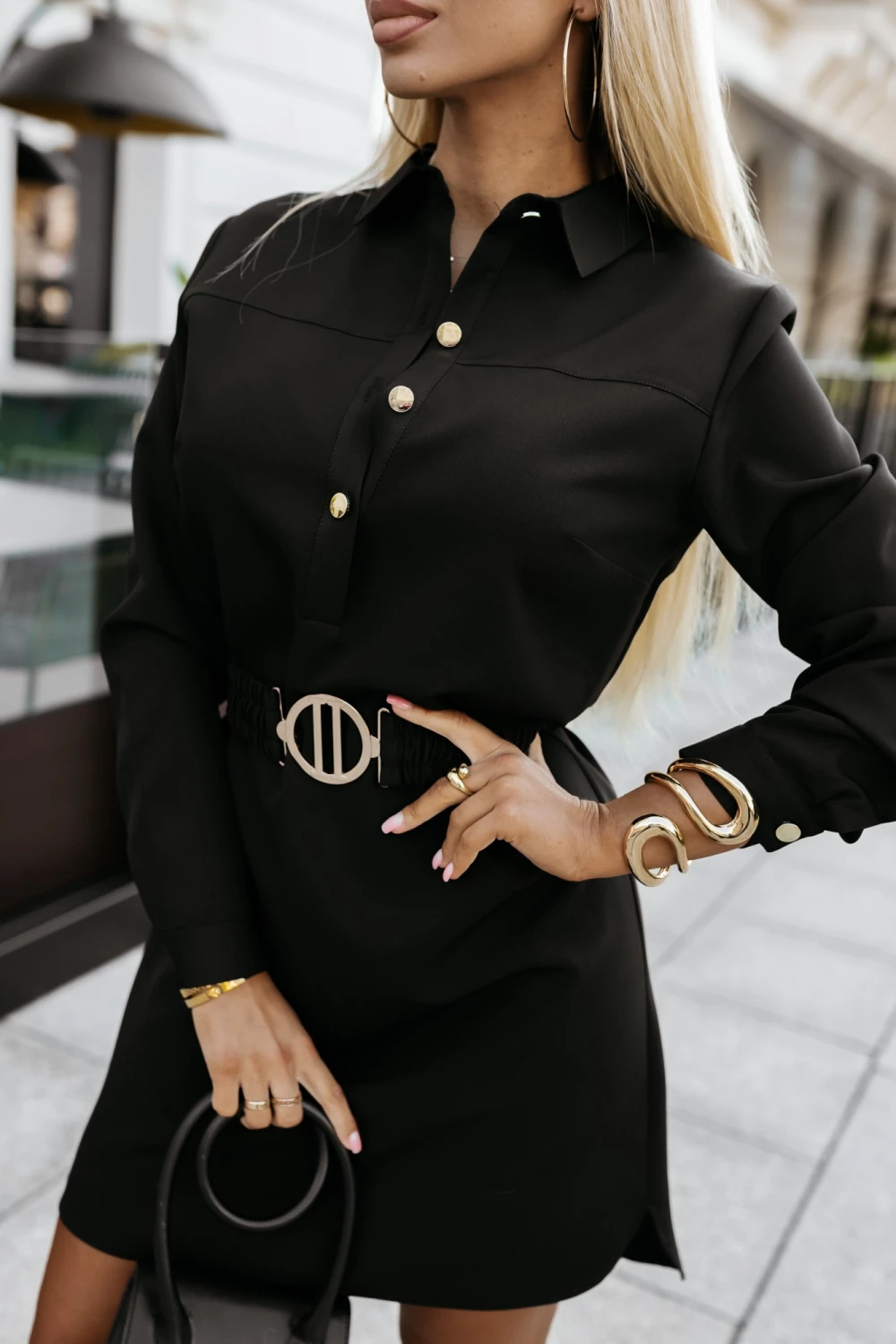 Klasyczna sukienka o koszulowym kroju. Sukienka z długim rękawem, kołnierzykiem oraz marszczonym paskiem w komplecie. Zdobią ją odpinane złote guziczki. Prosty krój sprawia, że pasuje na każdą figurę. Jest wygodna w noszeniu, a zarazem sprawi, że stylizacja stanie się modna i elegancka.