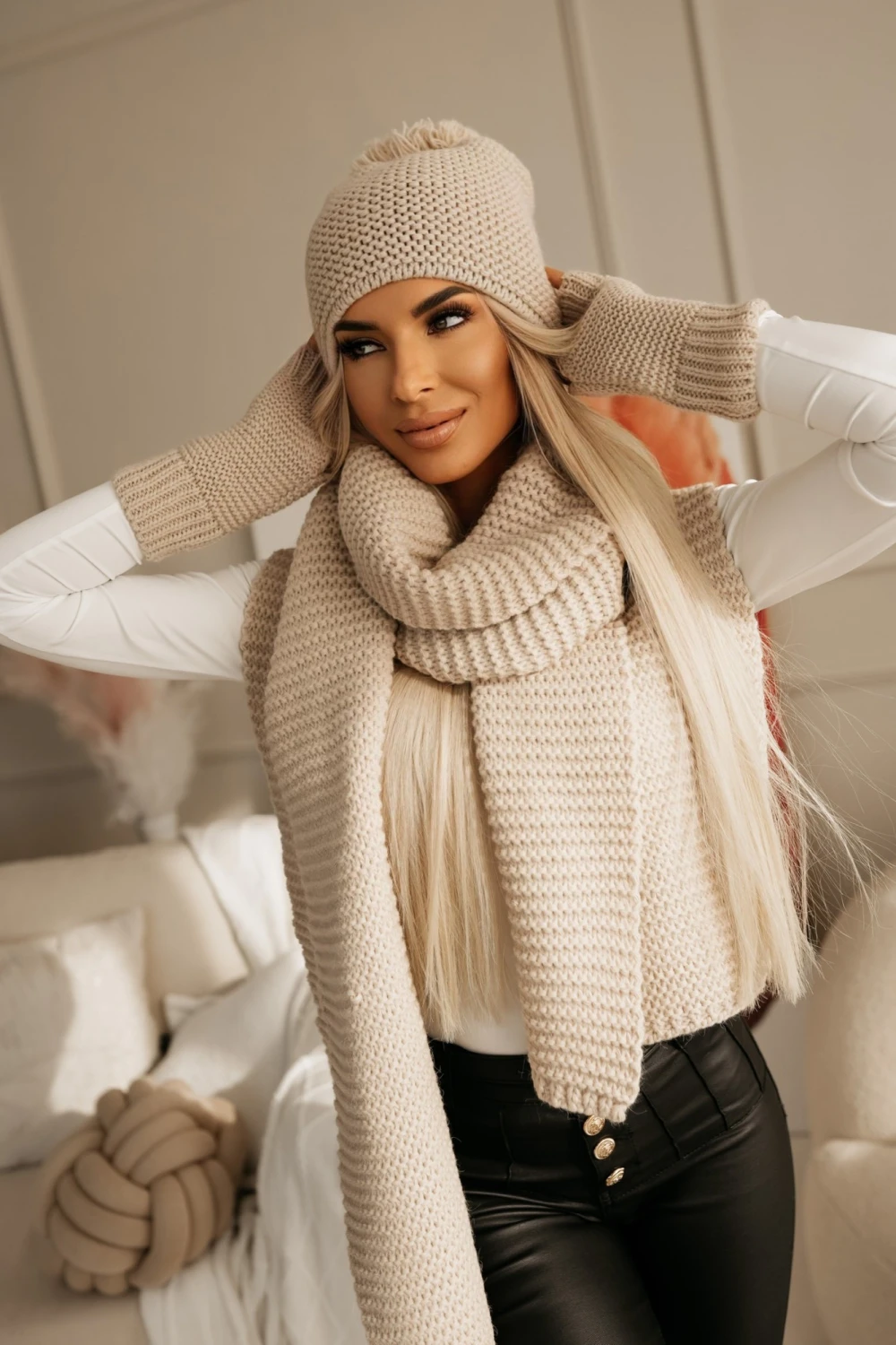 KOMPLET 3-CZĘŚCIOWY CZAPKA+SZAL + RĘKAWICZKI BEŻOWY