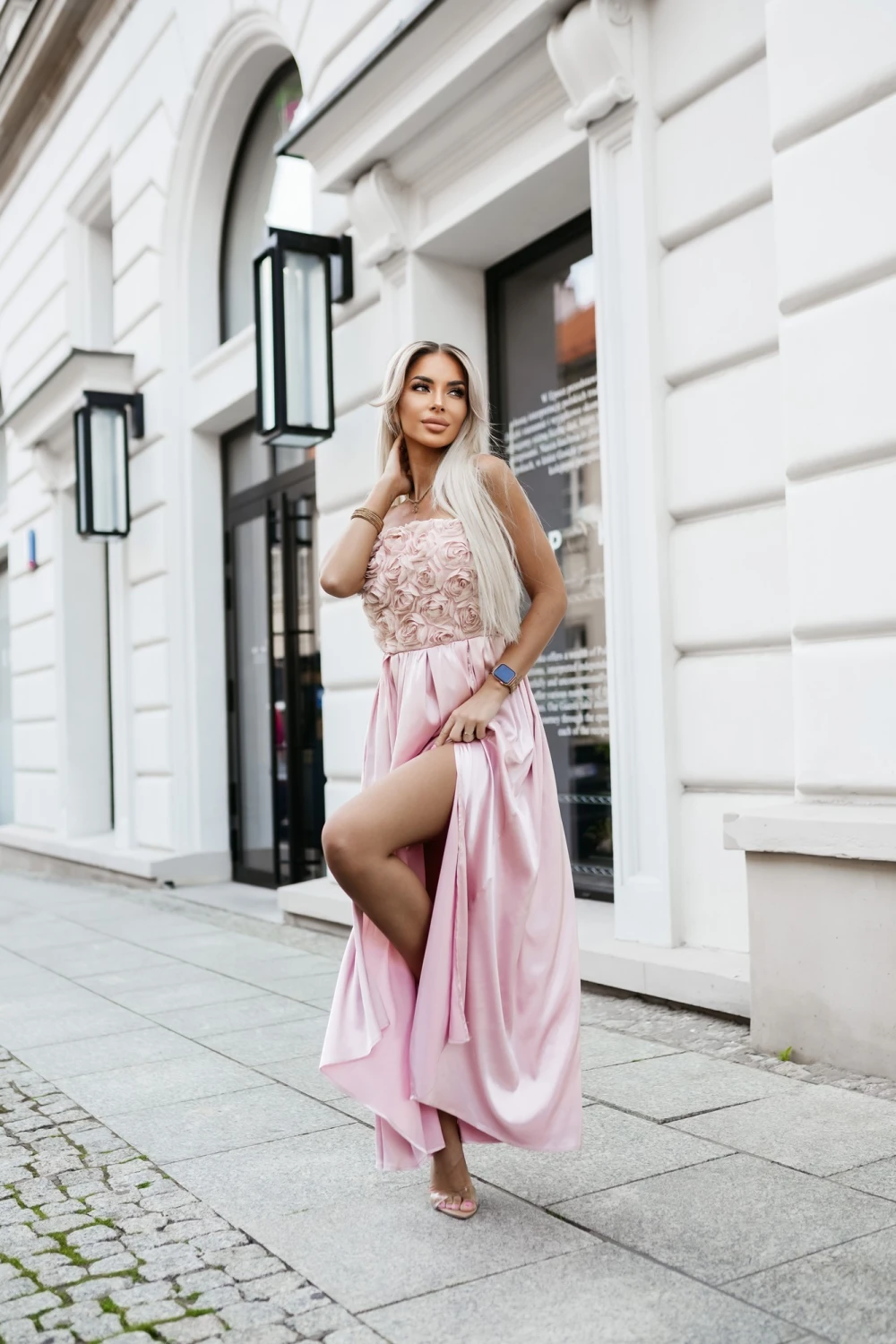 SUKIENKA MAXI SHEILA SATYNOWA ZDOBIONA NA GORSECIE KWIATAMI 3D BRUDNY RÓŻ