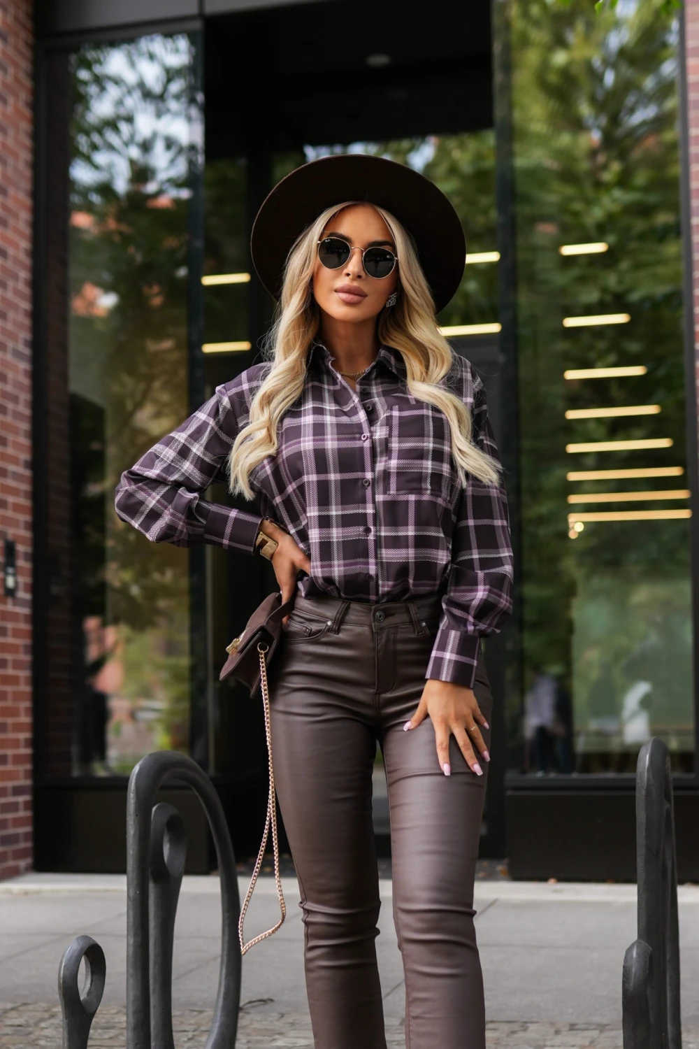 KOSZULA Z KIESZONKĄ ASYMETRYCZNA W KRATĘ CZEKOLADOWO-RÓŻOWA
