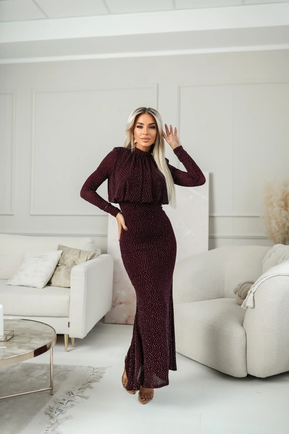 Olśniewająca sukienka maxi dla kobiet ceniących elegancję i wyjątkowy styl. Model ozdobiony cekinami na lekkiej siateczce, z poduszkami na ramionach, które dodają sylwetce wyrazistości. Góra sukienki jest luźna, z długim rękawem i klasyczną stójką, natomiast dół o kroju syrenki pięknie podkreśla figurę. Sukienka posiada zamek z tyłu i jest wyposażona w podszewkę, co zapewnia komfort noszenia. Idealna na wieczorne wyjścia, bankiety czy wyjątkowe okazje.