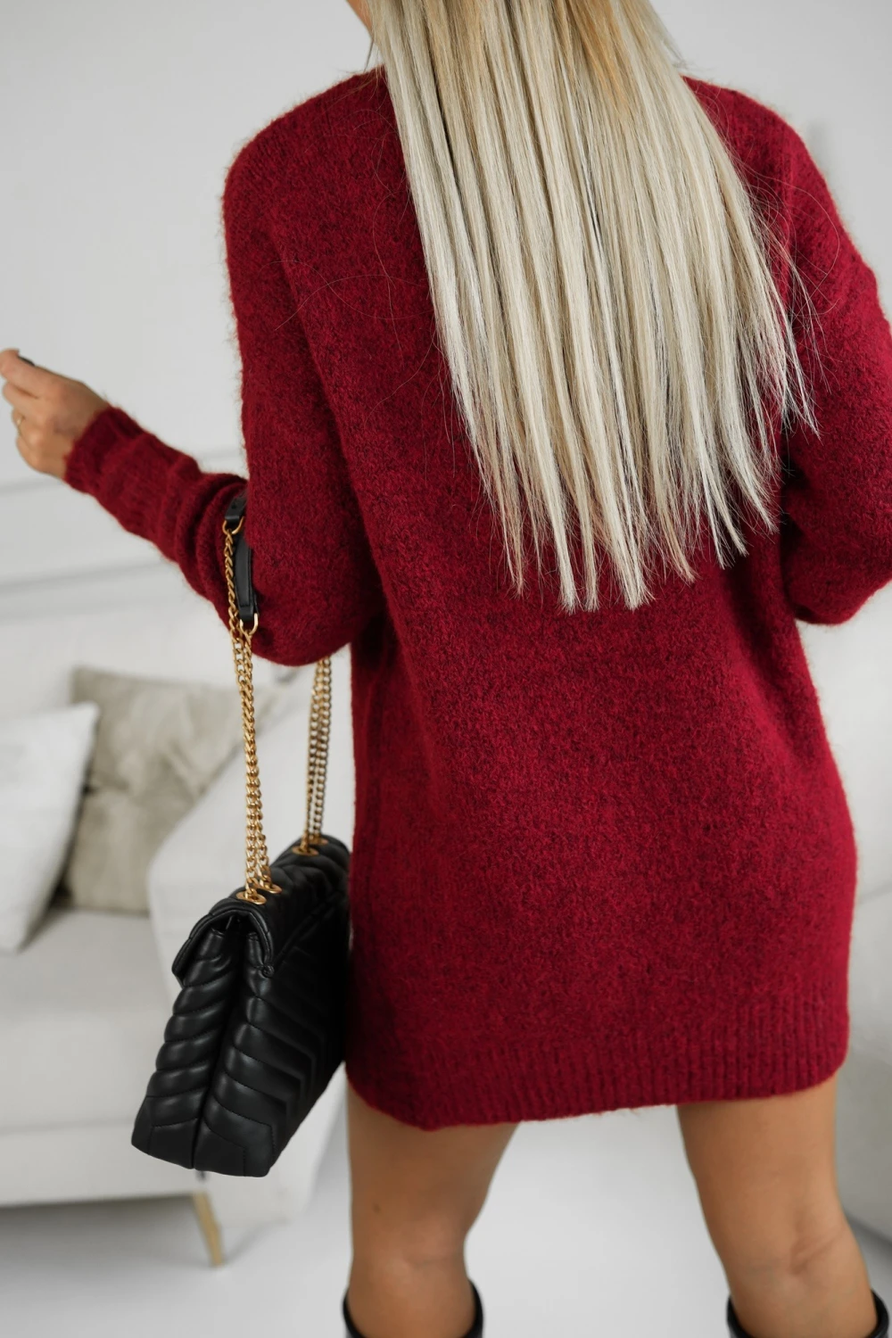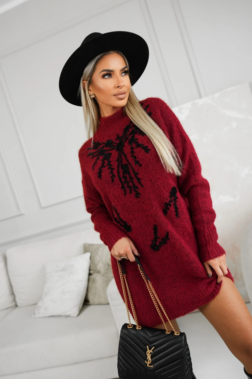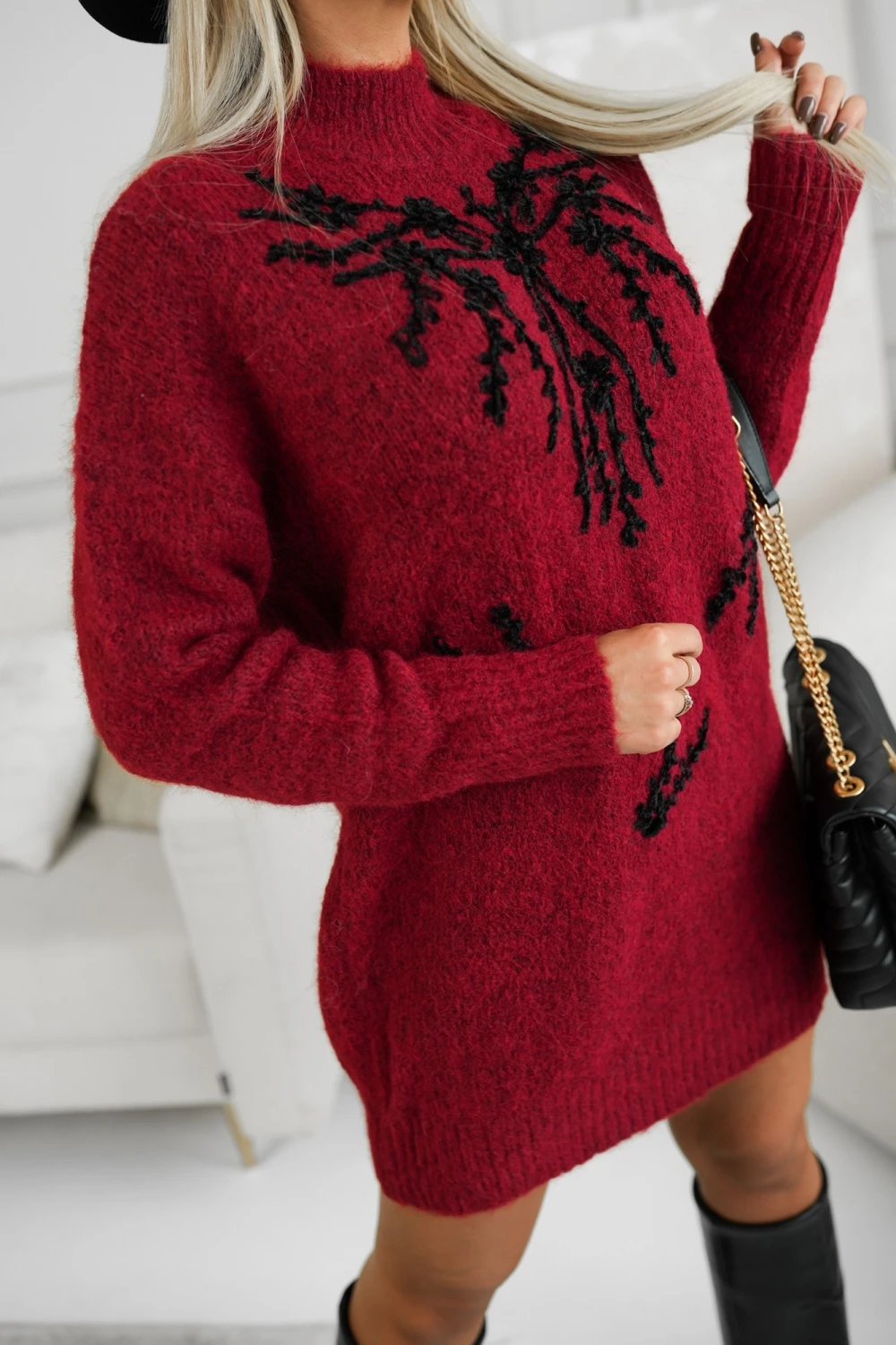 SUKIENKA SWETERKOWA TUNIKA W HAFTOWANE WZORY BURGUNDOWA