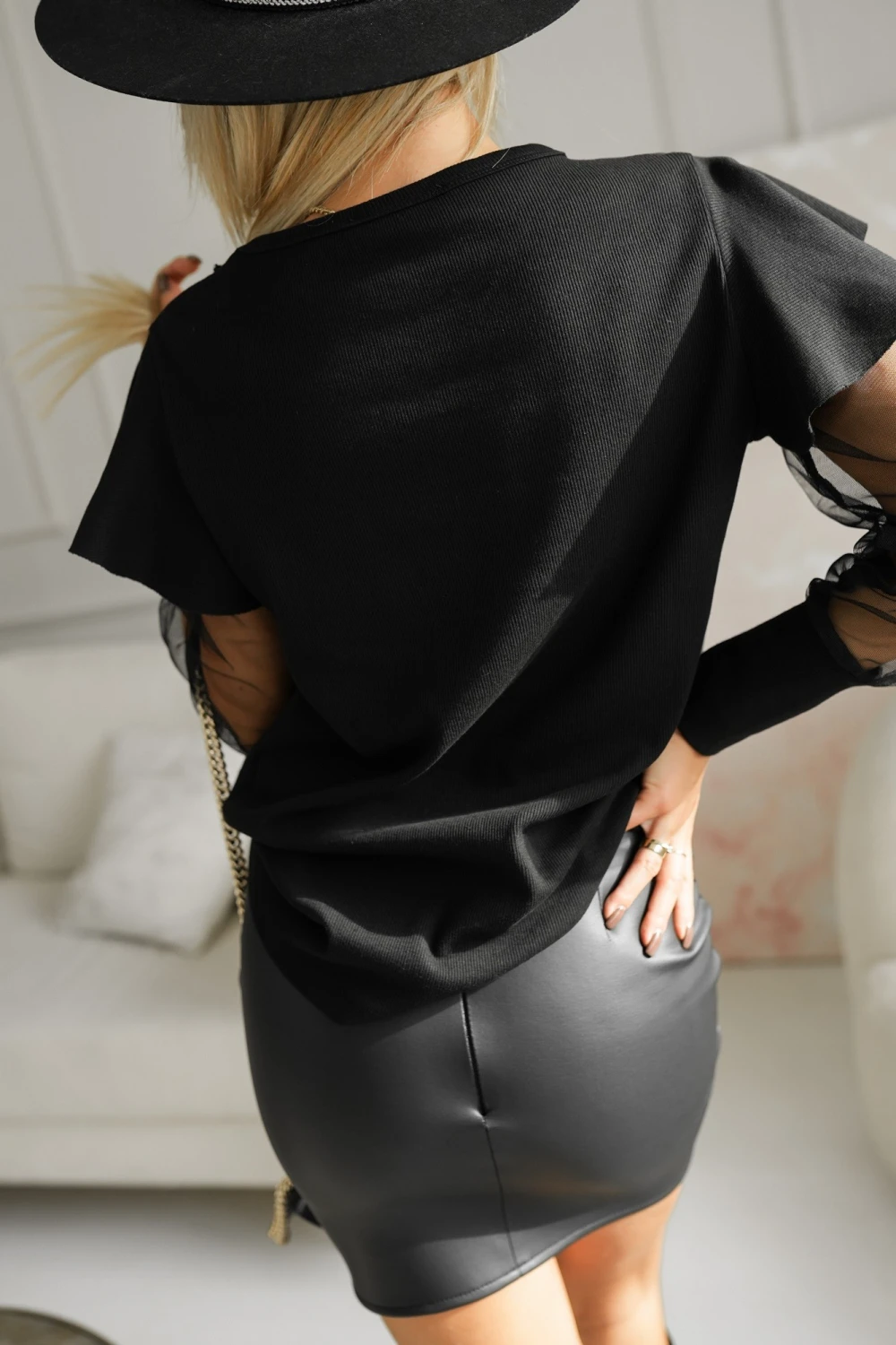 BLUZKA ZE WSTAWKĄ Z SIATECZKI Z OZDOBNYMI FALBANKAMI PRZY RĘKAWACH CZARNA