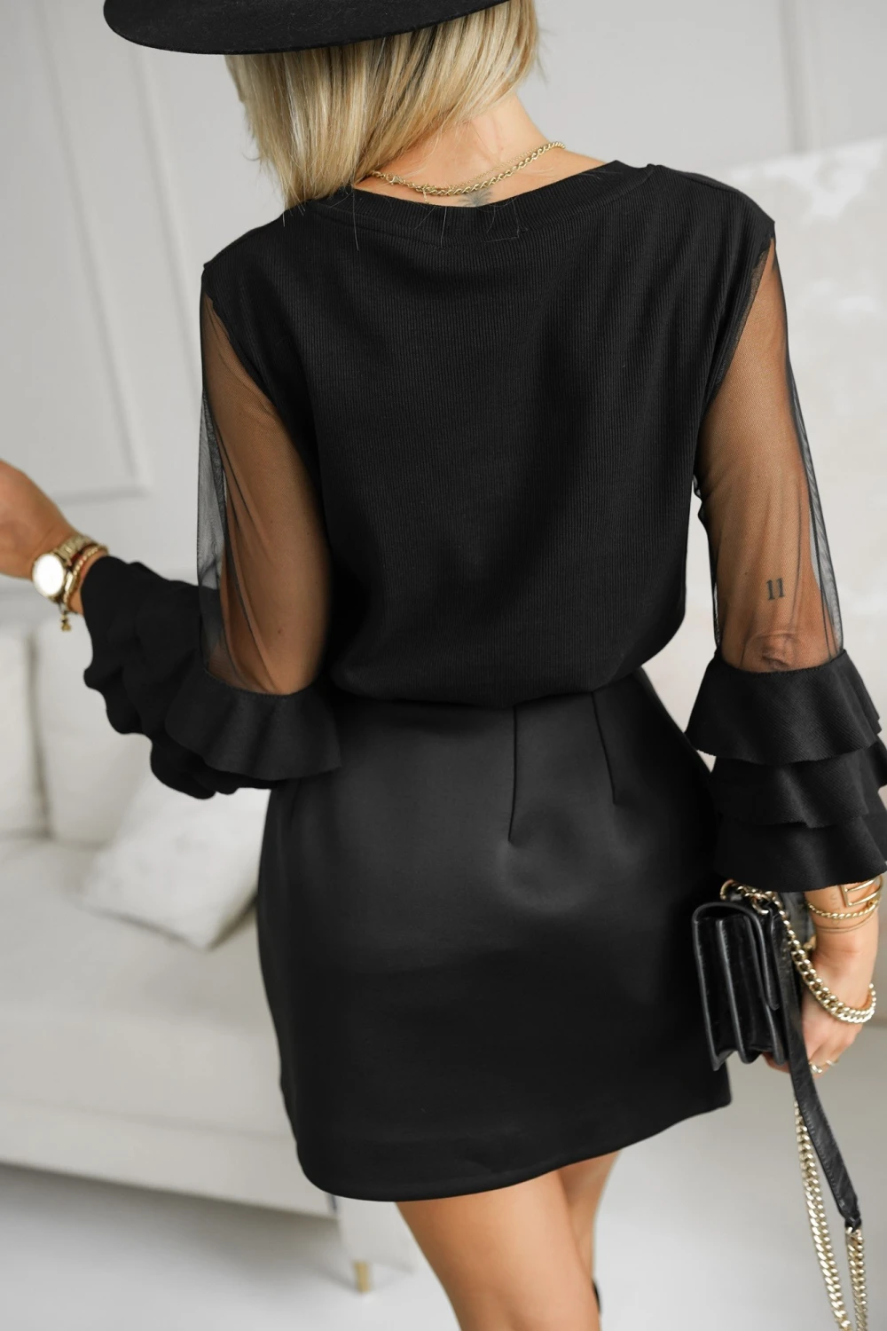 BLUZKA Z PRĄŻKOWANEGO MATERIAŁU Z RĘKAWAMI Z SIATECZKI CZARNA
