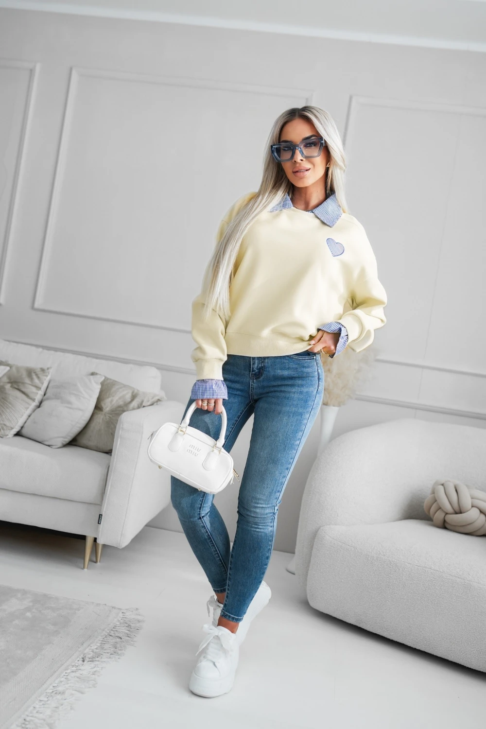 Stylowa bluza z kołnierzykiem, która łączy komfort casualowego fasonu z eleganckim akcentem. Model posiada koszulowe wstawki przy dekolcie oraz na zakończeniach rękawów, nadające całości oryginalnego, warstwowego efektu. Dół wykończony jest ściągaczem, dzięki czemu świetnie układa się na sylwetce. Z boku znajduje się naszywane serduszko, które dodaje subtelnego, kobiecego uroku. Idealna propozycja do codziennych stylizacji z nutą elegancji.
